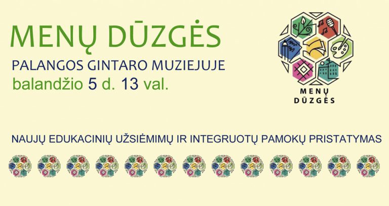 2018 m. EDUKACINIŲ UŽSIĖMIMŲ IR INTEGRUOTŲ PAMOKŲ PRISTATYMAS Ir šiemet kviečiame mokytojus į Palangos gintaro muziejų susipažinti su naujais edukaciniais užsiėmimais: Detektyvinis žaidimas – integruota istorijos, geografijos, fizinio pamoka; Palangoje kalbėk FR (edukacija moksleiviams, besimokantiems prancūzų k.); Gintaras šiuolaikiškai – dizaino dirbtuvės. Dalį jų išbandysime praktiškai. Mokytojai, kurie pirmą kartą lankysis mūsų muziejuje, bus supažindinti … Tęskite 2018 m. edukacinių užsiėmimų ir integruotų pamokų pristatymas „Menų dūzgės“ skaitymą