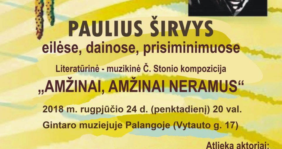 M. K. Čiurlionio kultūros ir paveldo fondas 2018 m. rugpjūčio 24 d. (penktadienį) 20.00 val. Palangos gintaro muziejuje (Vytauto g. 17, Palanga) kviečia pamatyti Česlovo Stonio kompoziciją „AMŽINAI, AMŽINAI NERAMUS“ (Paulius Širvys – eilėse, dainose, prisiminimuose). Su šia programa tautiečius mūsų fondas supažindino jau dvidešimt kartų: Paberžėje (Kėdainių rajone), Plateliuose (Plungės rajone), M. K. … Tęskite Česlovo Stonio kompozicija „AMŽINAI, AMŽINAI NERAMUS“ (Paulius Širvys – eilėse, dainose, prisiminimuose). skaitymą