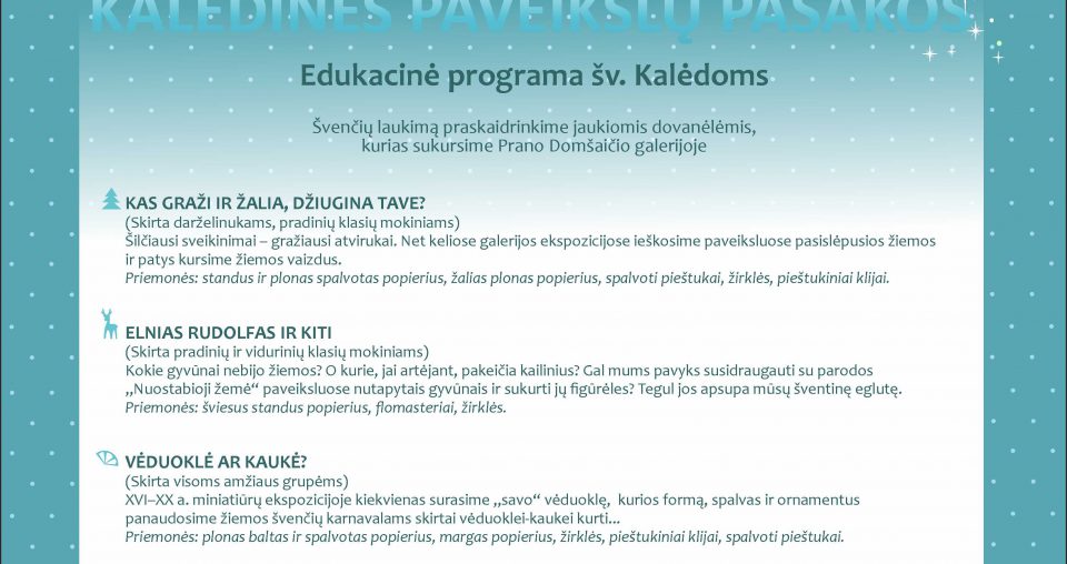 Švenčių laukimą praskaidrinkime jaukiomis dovanėlėmis, kurias sukursime Prano Domšaičio galerijoje KAS GRAŽI IR ŽALIA, DŽIUGINA TAVE? (Skirta darželinukams, pradinių klasių mokiniams) Šilčiausi sveikinimai – gražiausi atvirukai. Net keliose galerijos ekspozicijose ieškosime paveiksluose pasislėpusios žiemos ir patys kursime žiemos vaizdus. Priemonės: standus ir plonas spalvotas popierius, žalias plonas popierius, spalvoti pieštukai, žirklės, pieštukiniai klijai. ELNIAS … Tęskite Edukacinė programa Šv. Kalėdoms „Kalėdinės paveikslų pasakos“ skaitymą