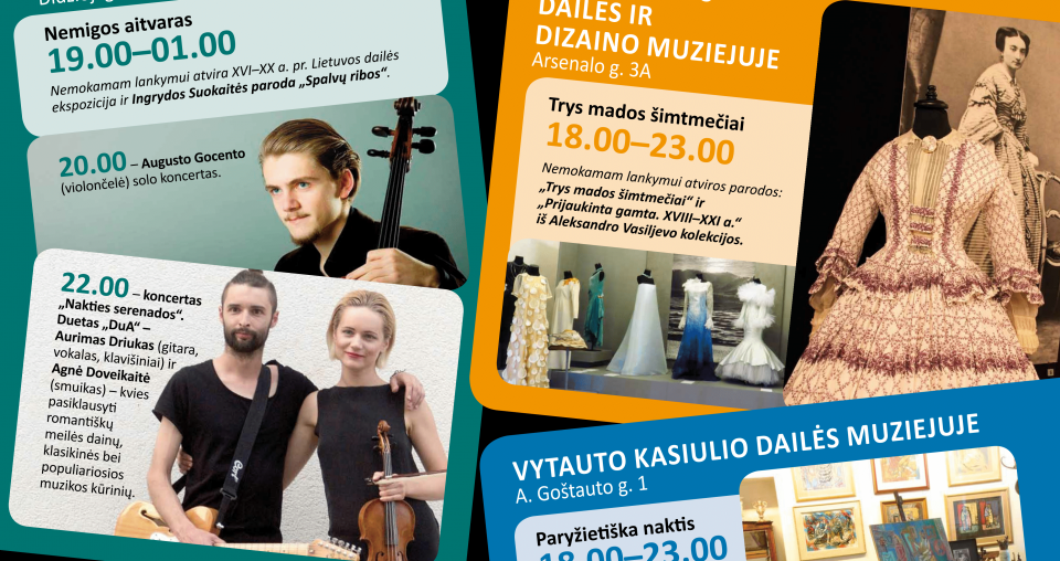 VILNIAUS PAVEIKSLŲ GALERIJOJE Didžioji g. 4 • Informacija tel. (8 5) 212 42 58 Nemigos aitvaras 19.00–01.00 Tęsiamas dailės ir muzikos renginių ciklas „Nemigos aitvaras“. Nemokamam lankymui atvira XVI–XX a. pr. Lietuvos dailės ekspozicija ir Ingrydos suokaitės paroda „Spalvų ribos“. 20.00 – Augusto Gocento (violončelė) solo koncertas. 22.00 – koncertas „Nakties serenados“. Duetas „DuA“ – … Tęskite Kultūros naktis Lietuvos dailės muziejaus padaliniuose. Padaliniai dirbs nuo 18 val. skaitymą