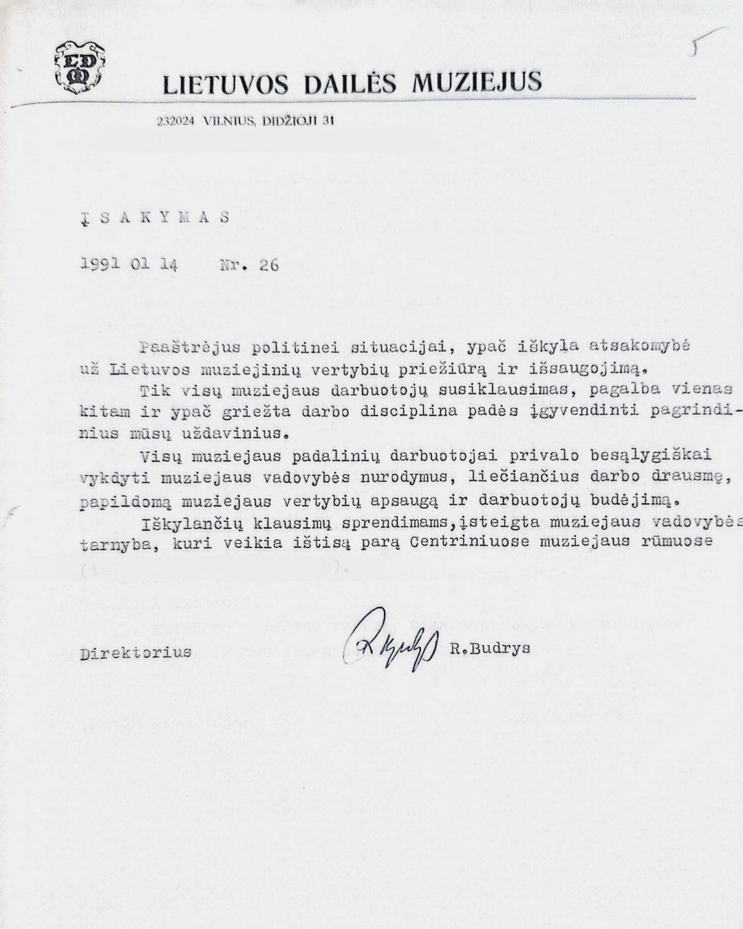 1991-01-14 Lietuvos dailės muziejaus direktoriaus įsakymas